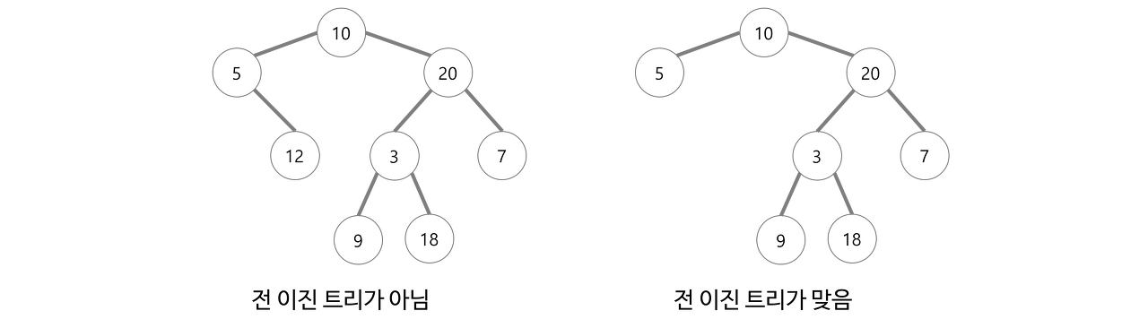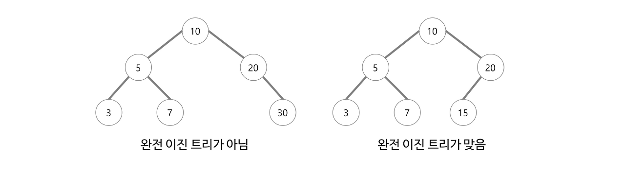 - 모든 말단 노드는 같은 높이에 있어야 하면서 마지막 레벨이 꽉 채워져 있어야 함