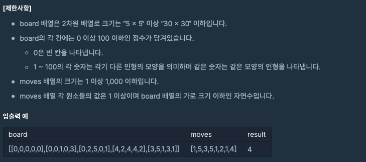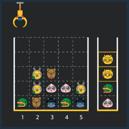 간단하게 요약하자면 위와 같이 인형 뽑기 기계가 있습니다. 이런 인형 뽑기 기계는 N * N의 크기로 이루어져 있으며 뽑을 가로 칸을 입력하면 무조건 뽑게 되어있으면 뽑은 인형은 옆의 바구니로 이동합니다. (바구니의 크기는 제한 없음)