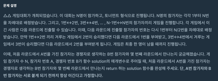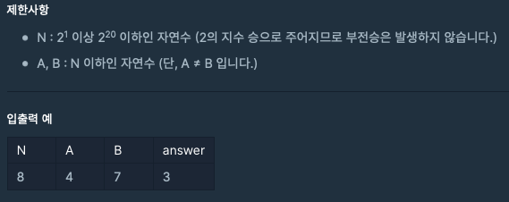 문제는 간단했습니다. 모두가 아는 토너먼트형식의 게임에서 A, B 두사람이 어떤 라운드에 만나게 되는지 구하는 문제입니다.