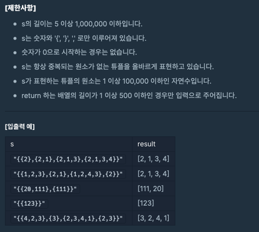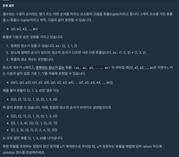2019 카카오 개발자 겨울 인턴쉽에 출제된 문제입니다. 이름은 튜플이지만 주로 문자열을 다루는 문제입니다.