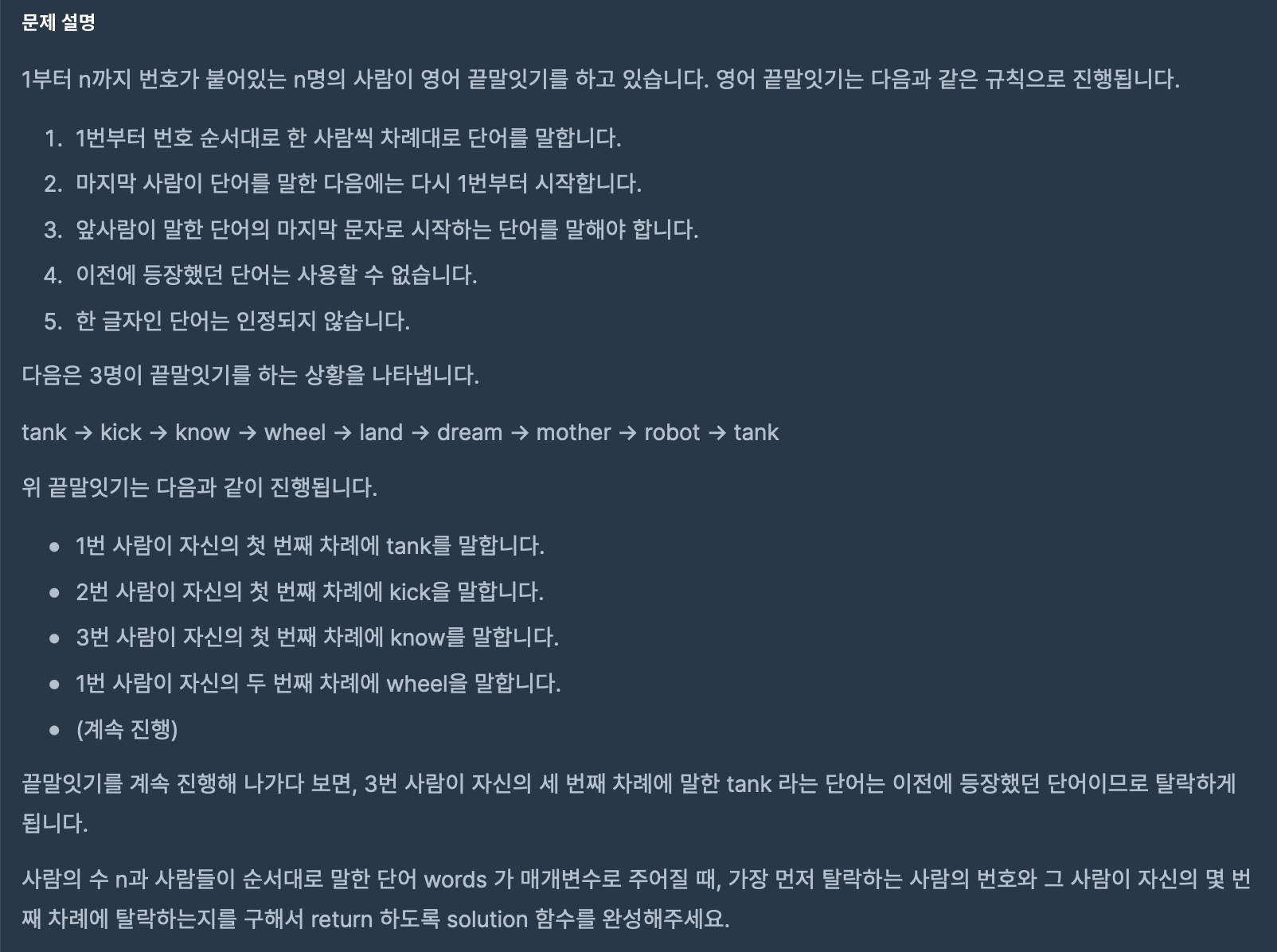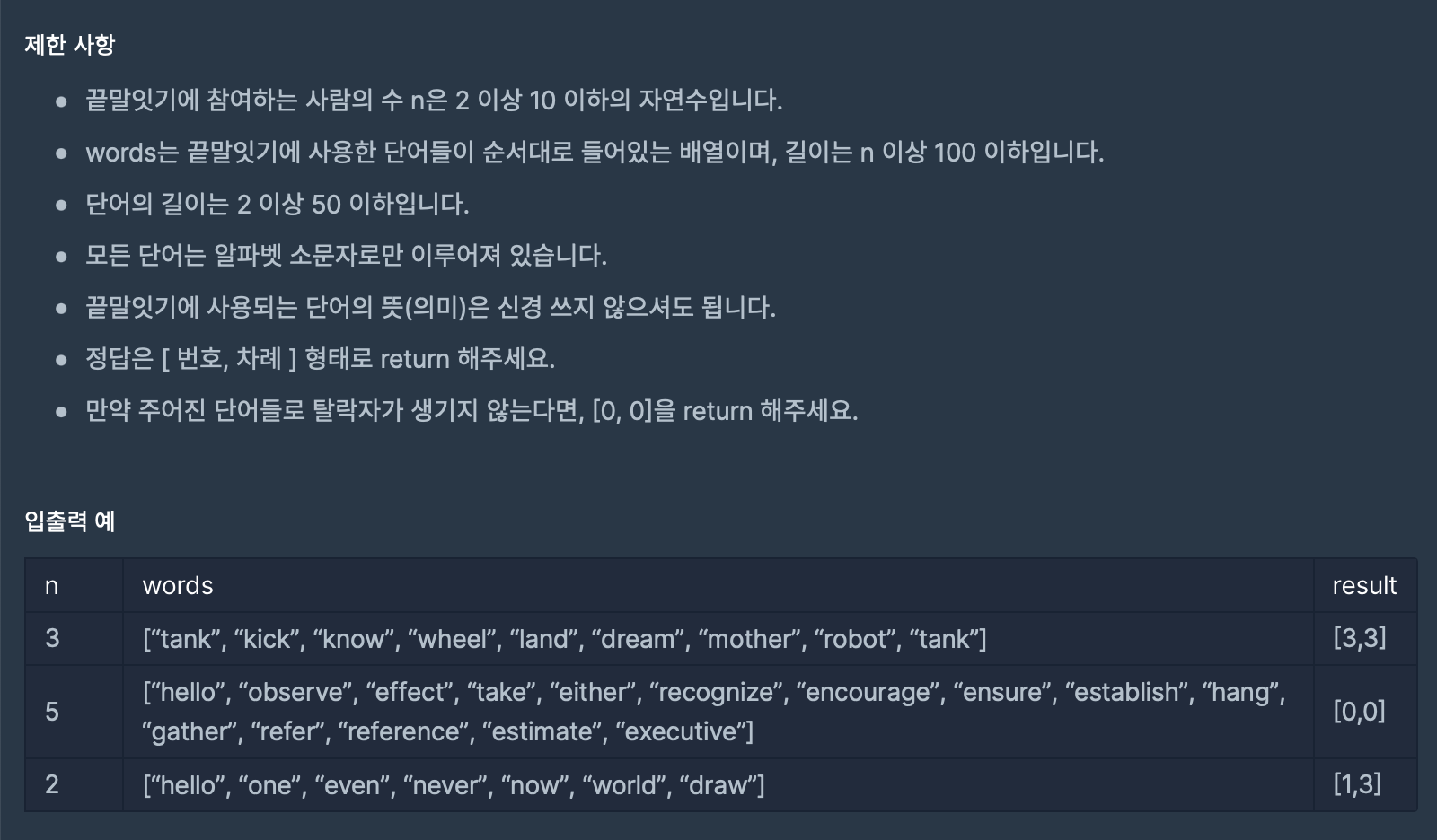 제한 사항은 간단한 내용입니다. 중복된 단어 혹은 끝말을 잇지 못한 단어를 말한 사람이 탈락하게 됩니다.