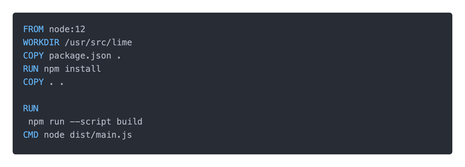 Dockerfile은 NestJS앱을 빌드한 후 컨테이너가 실행되었을 때 dist/main.js 파일을 실행합니다.