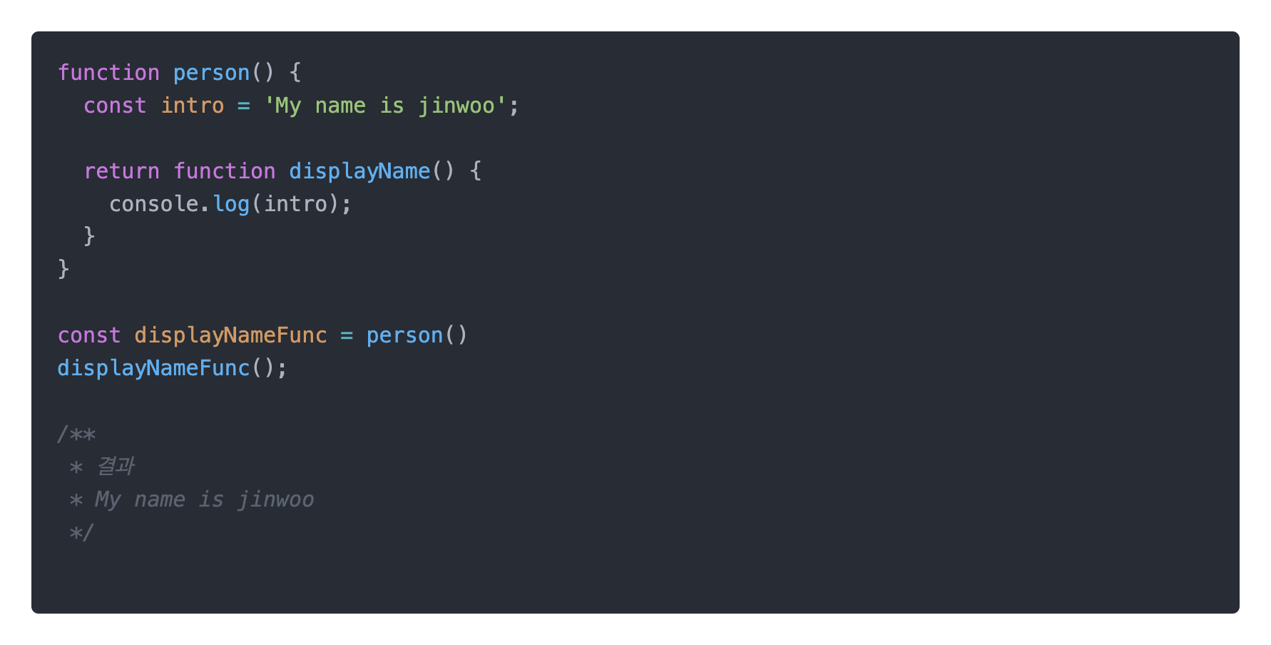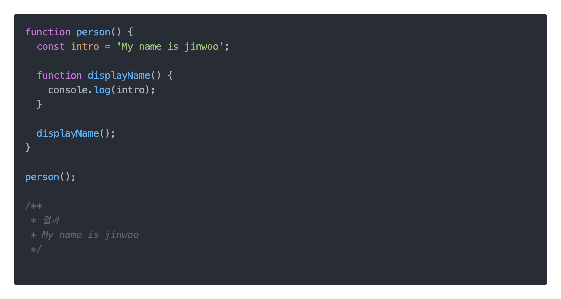 displayName함수에서 intro변수에 접근하여 정상적으로 실행됐습니다. 이로 내부 함수에서는 외부 함수의 값을 접근할 수 있다는 것을 알 수 있습니다.