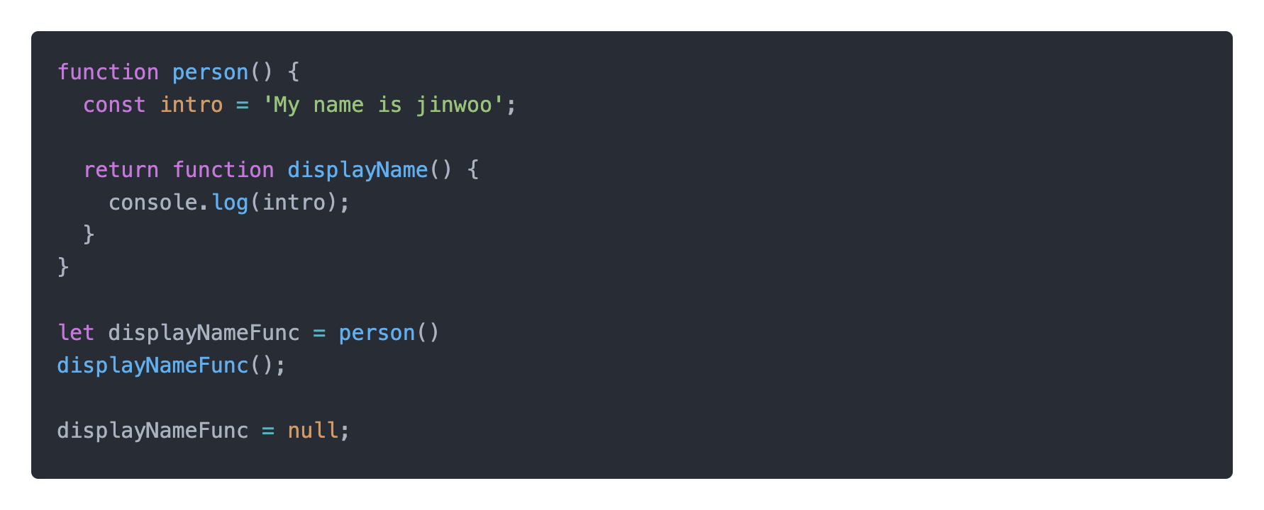 여기서 person()이 실행된 후 displayName을 반환한 후 종료된 함수의 변수인 intro는 사려져야합니다. 하지만 왜displayNameFunc()를 통해 정상적으로 intro의 값이 로그에 찍히는 걸까요?