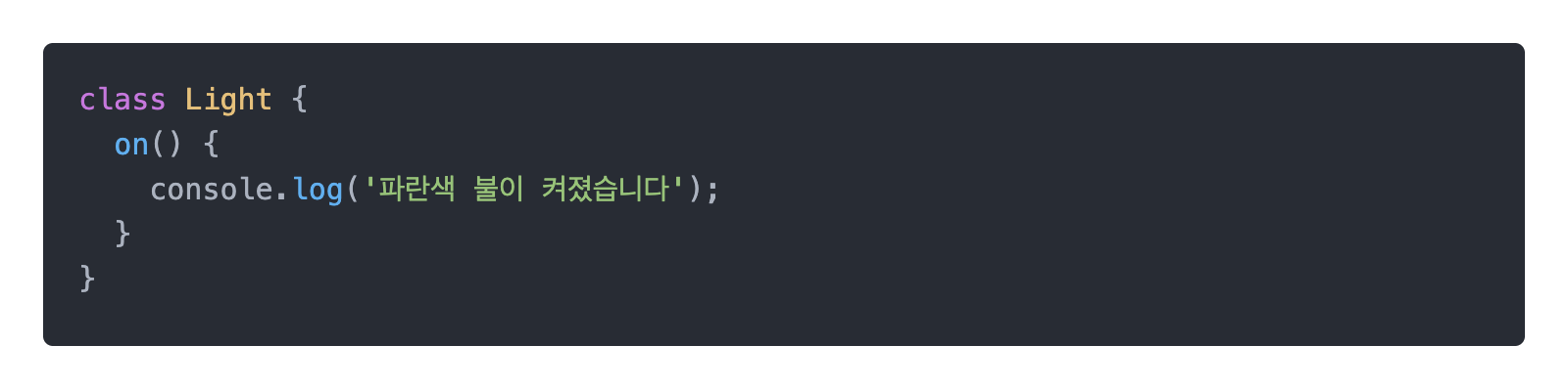 위의 예제에서 Light클래스의 on메서드는 빨간색 불을 킵니다. 하지만 만약 파란색불이 켜지도록 바꾸고 싶다면 아래와 같이 바꿔야 겠죠?