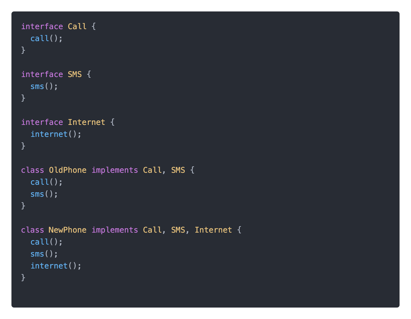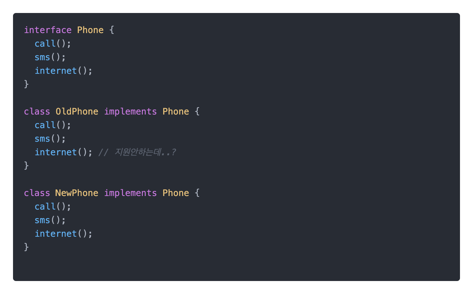 그렇다면 internet 메서드를 Phone인터페이스에서 정의하지 않고 NewPhone 클래스에서 정의하여 구현하면 되지 않을까? 라는 생각이 들 수 있습니다. 하지만 앞으로의 모든 폰에 각각 internet메서드를 정의하고 구현해야됩니다.