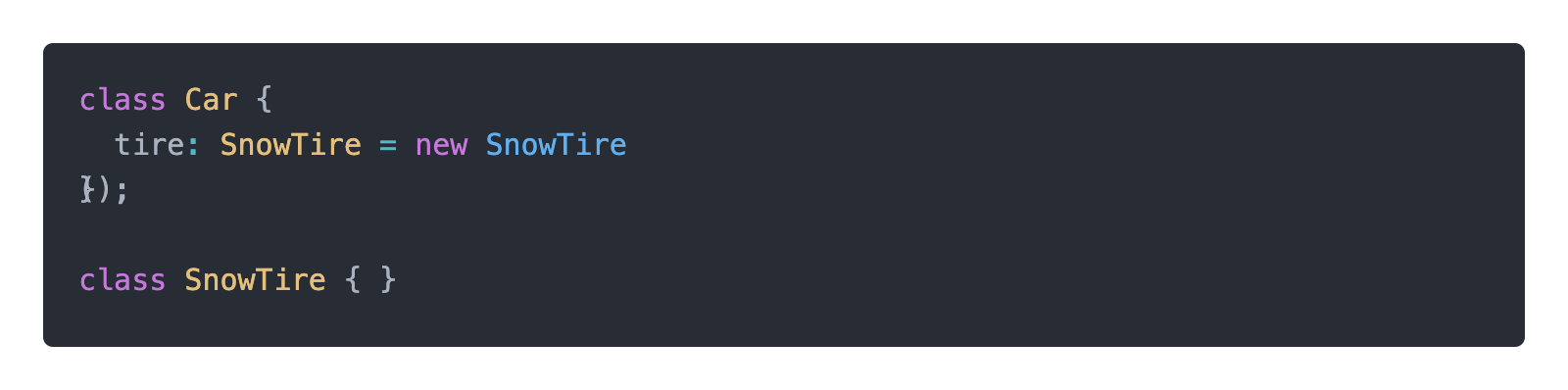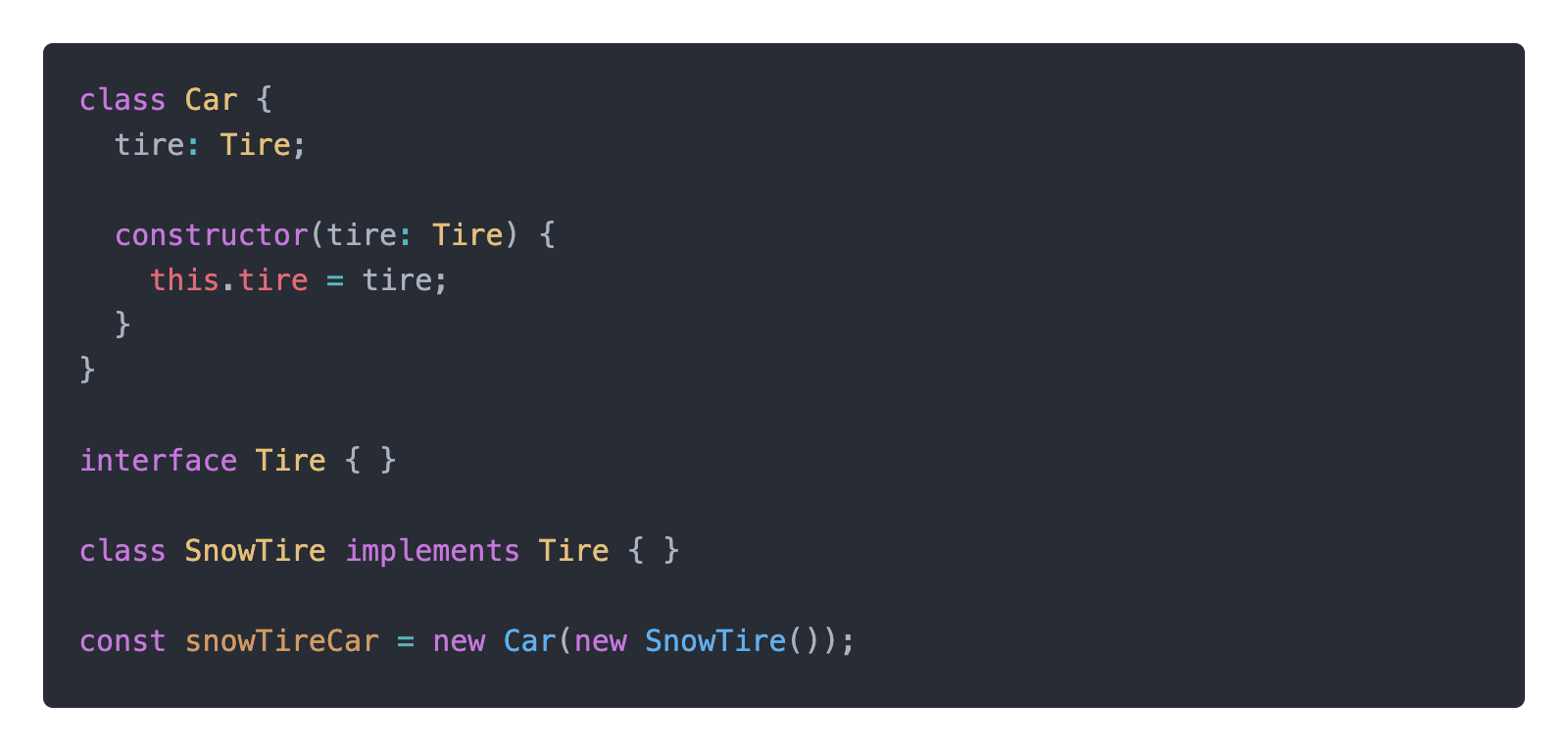하지만 여전히 Car 클래스는 SnowTire에 의존하고 있습니다. 그렇다면 외부에서 의존성을 주입할 수 있습니다.
