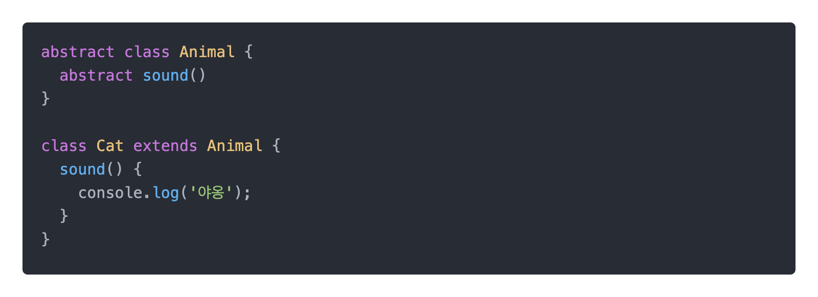 조금 억지스로운 예제일 수 있지만 이해하기 쉬운 예제인것 같습니다. Animal 클래스를 상속받는 Cat 클래스는 sound메서드를 오버라이딩 합니다.