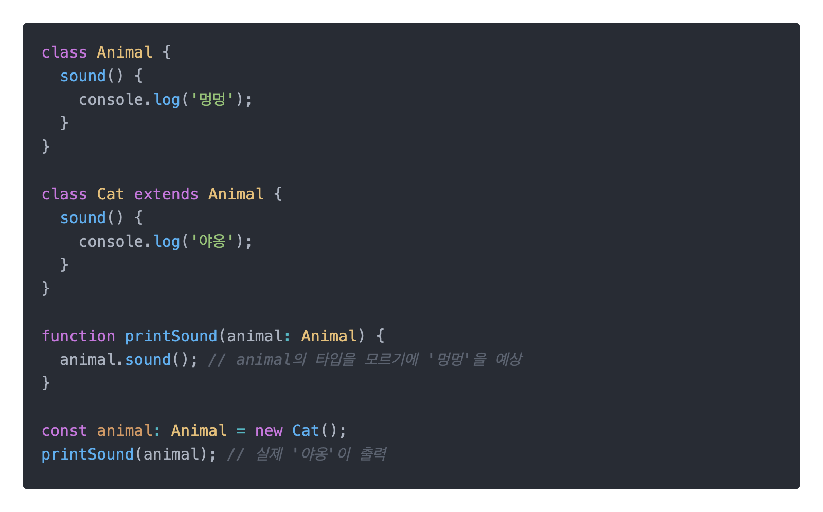 이때 printSound 함수는 animal의 정확한 타입인 Cat을 모르기 때문에 멍멍이 출력될 것 이라고 예상합니다. 하지만 야옹이 실제로 출력됩니다.