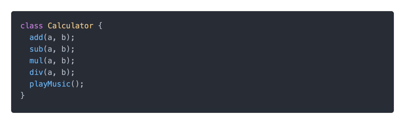 하지만 기능 중 음악을 재생하는 기능이 생겼을때 위와 같이 Caculator에 playMusic을 추가하는 것은 단일 책임 원칙에 위배됩니다.