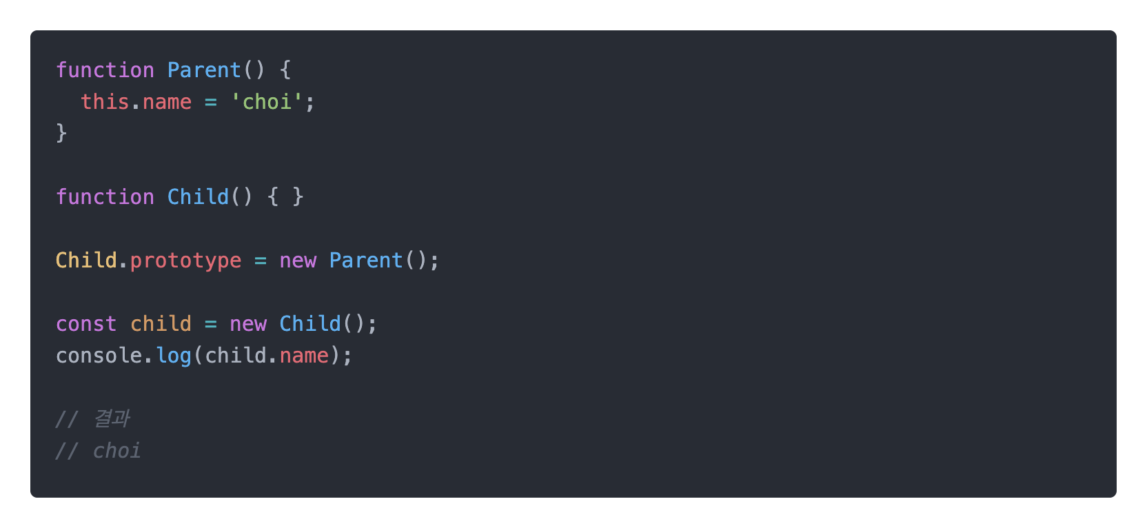 간단히 설명을 하고 코드 예제로 알아보겠습니다. Parent에 해당되는 내용은 쉽게 이해하기 위해 생성자 함수라고 생각하면 됩니다. 생성자 함수에서 생성된 객체는 Child입니다.