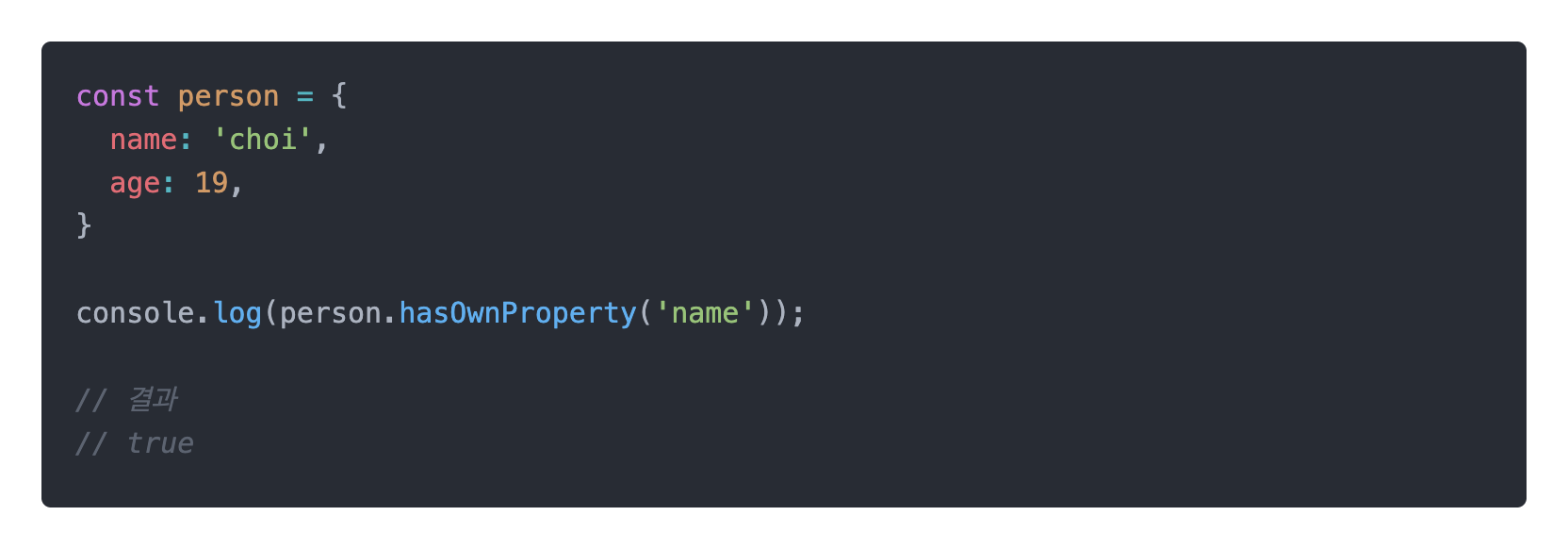 위의 예제에서 person이라는 객체는 hasOwnProperty라는 함수를 정의하지 않았습니다. 하지만 정상적으로 작동한다는 것을 알 수 있습니다.