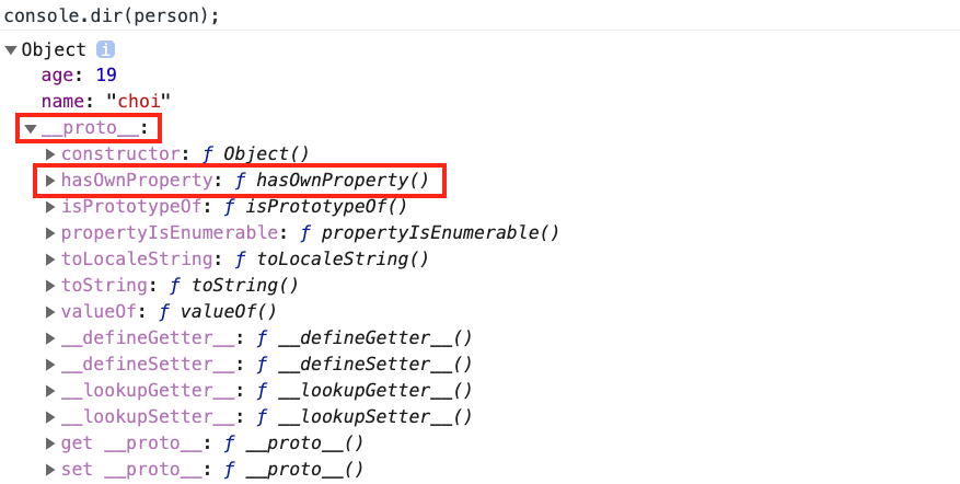 위의 이미지를 보면 person의 __proto__에 hasOwnProperty라는 메서드가 있습니다.
