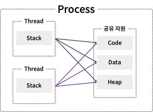 두개 이상의 스레드가 프로세스 내부에서 자원을 공유하여 작업을 수행합니다.