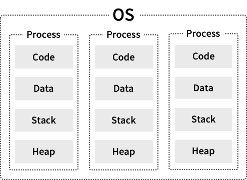 운영체제는 프로세스마다 각각 독립된 Code, Data, Stack, Heap 영역으로 메모리를 할당해줍니다.