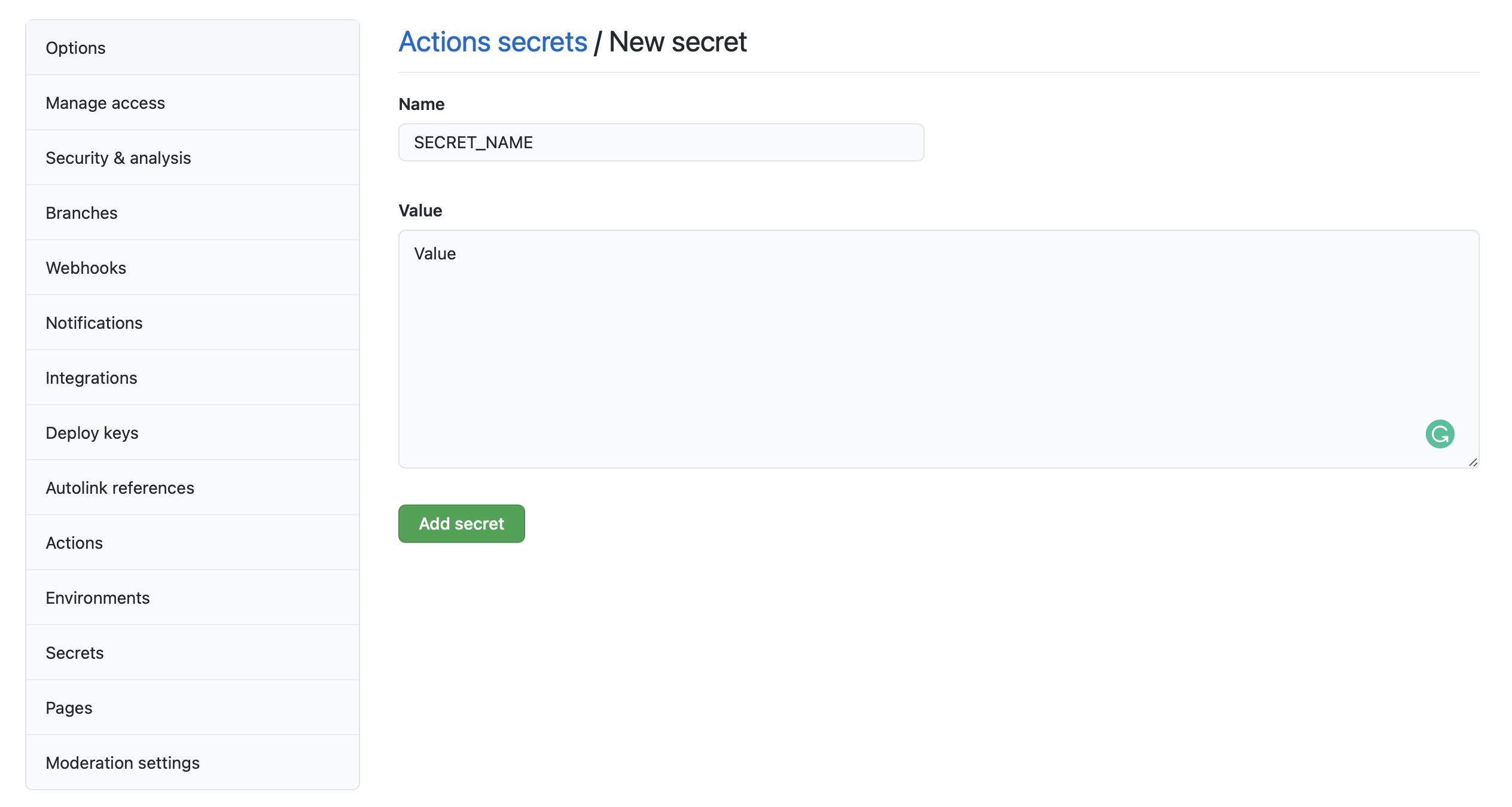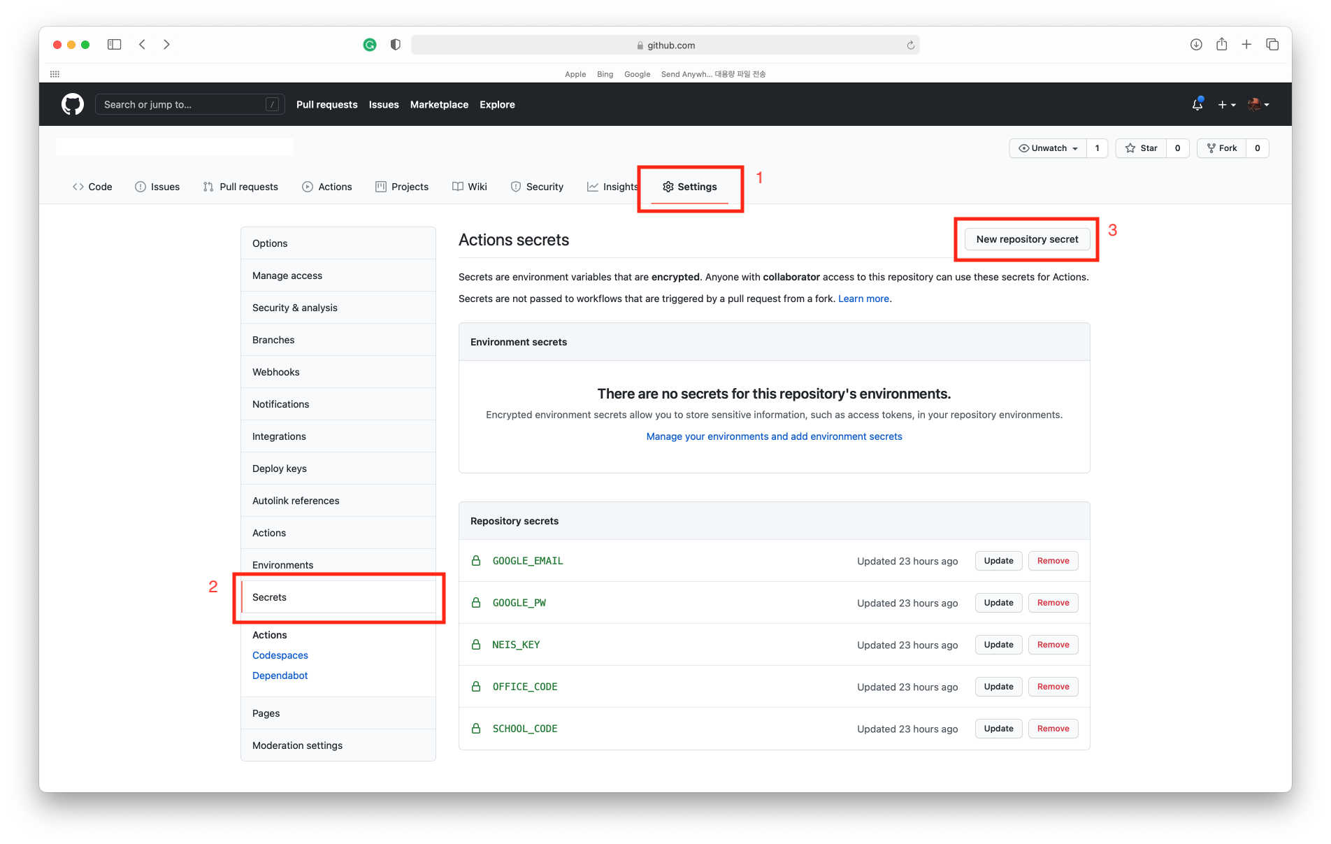 Github Actions를 설정할 저장소의 Settings > Secrets > New repository secret로 들어갑니다.