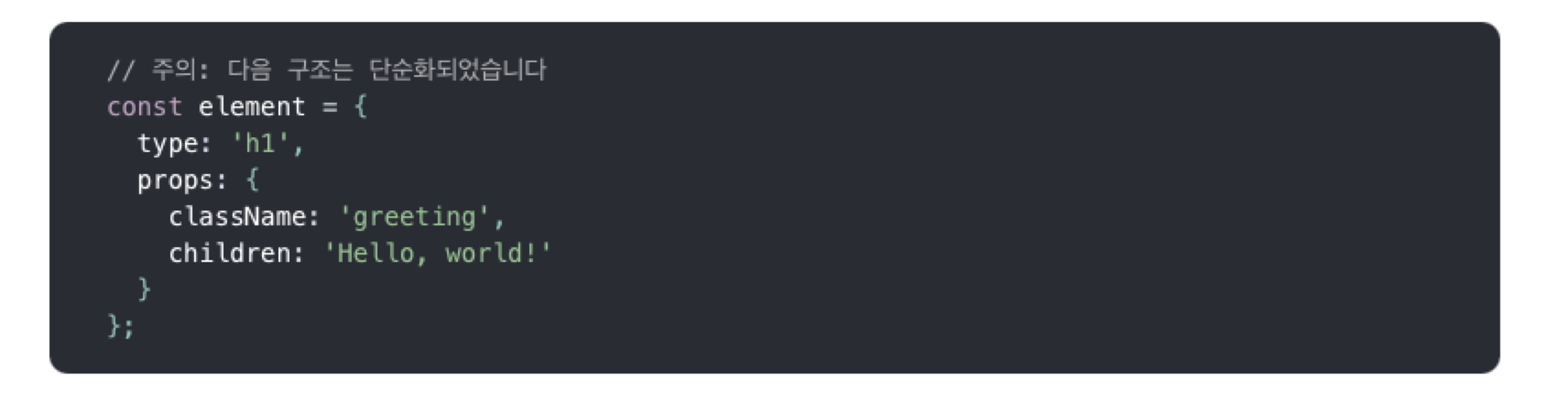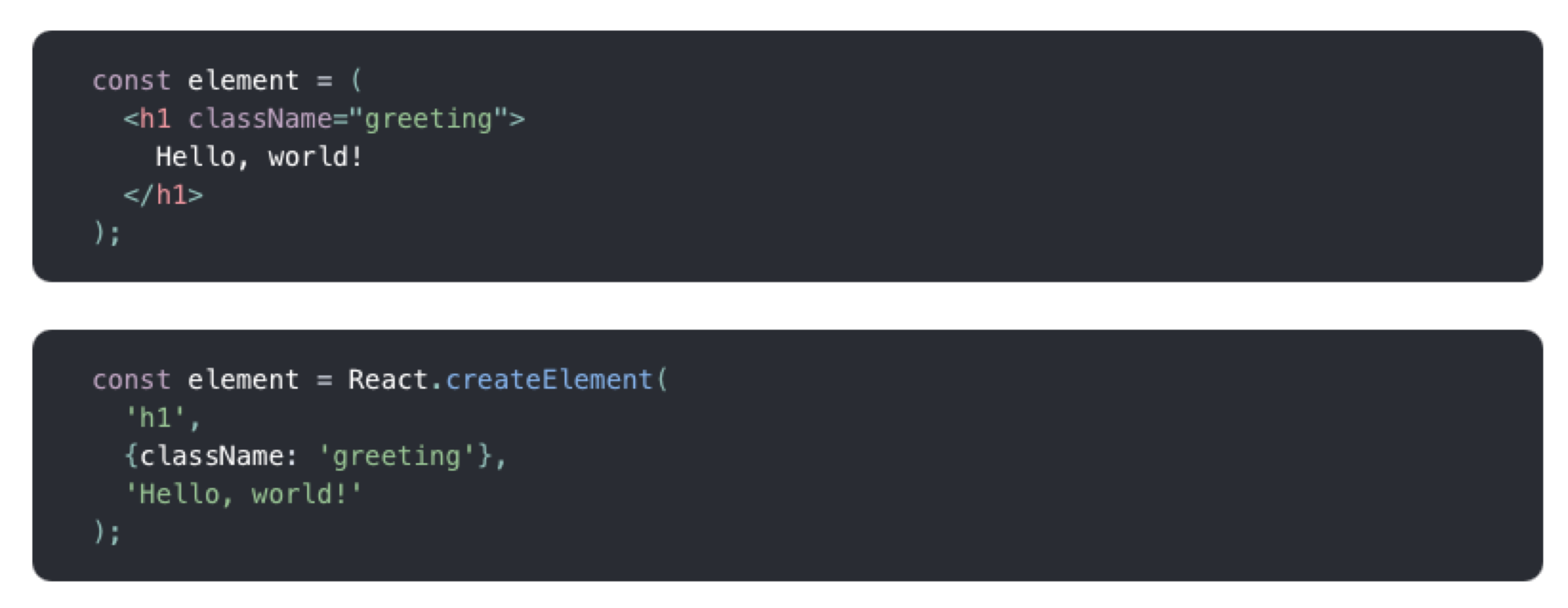 Babel은 JSX를 아래와 같은 React.createElement() 호출로 컴파일하게 됩니다. 이후 React.createElement()는 아래와 같은 객체를 생성합니다.