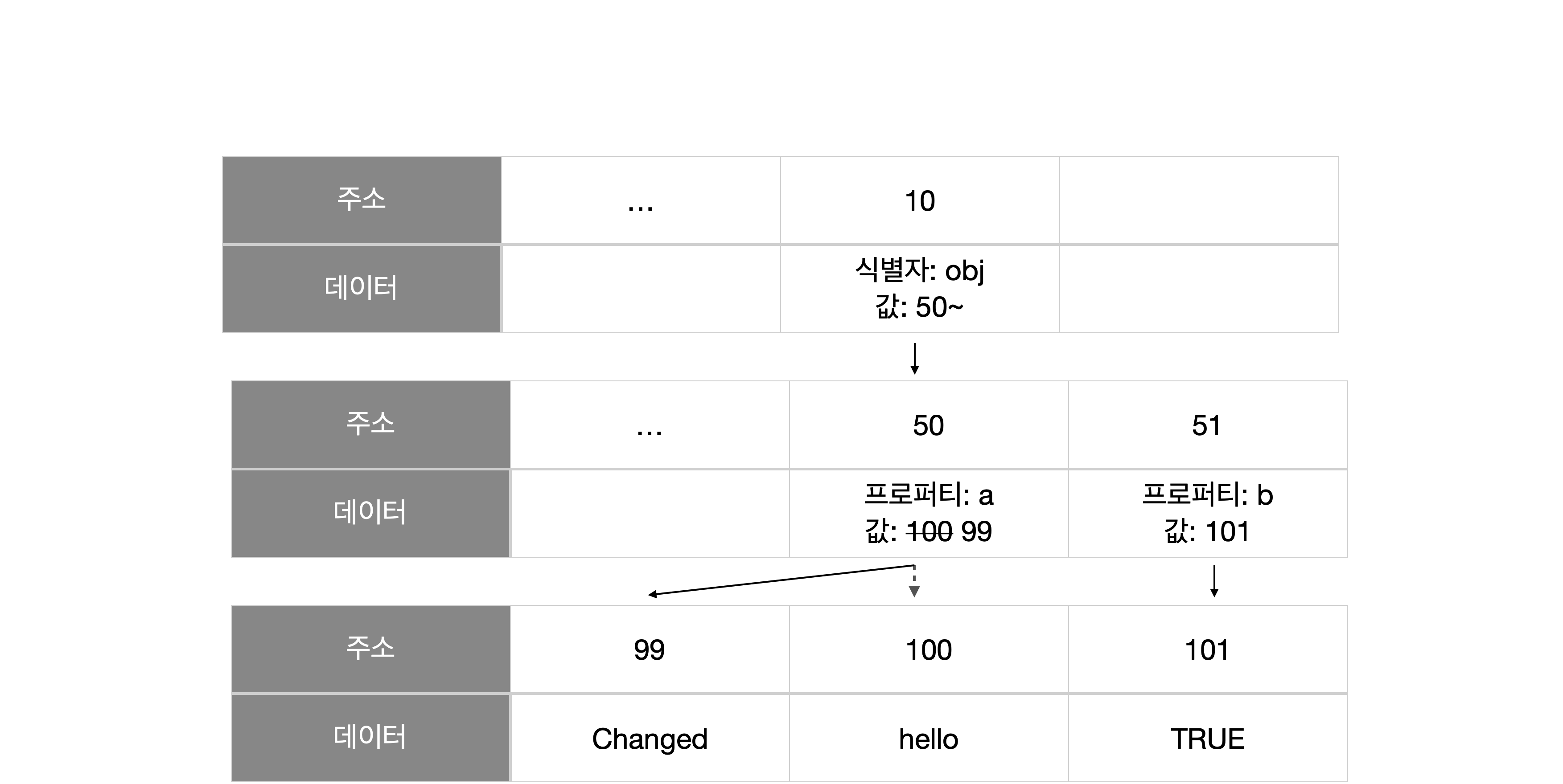 이렇게 같은 주소-100을 가르키게 됩니다. 아까 위에서 바로 값을 가지지 않는 이유를 조금 아실것 같나요? 맞습니다. 중복된 값에 대해 메모리 효율을 높이기 위해서입니다. 중복된 값이 생길때 마다 새롭게 만들기 보다 기존에 있던 값을 참조하면 되기 때문이죠