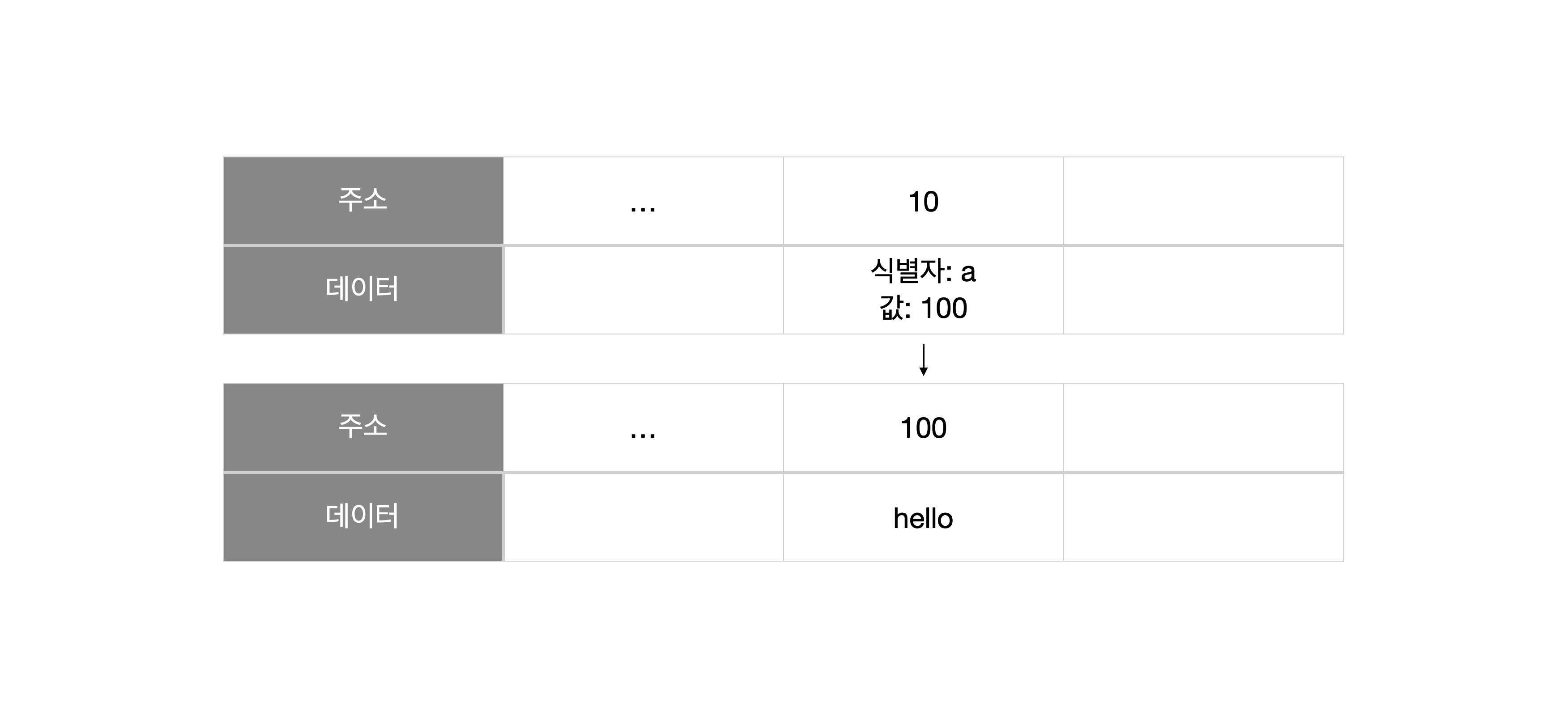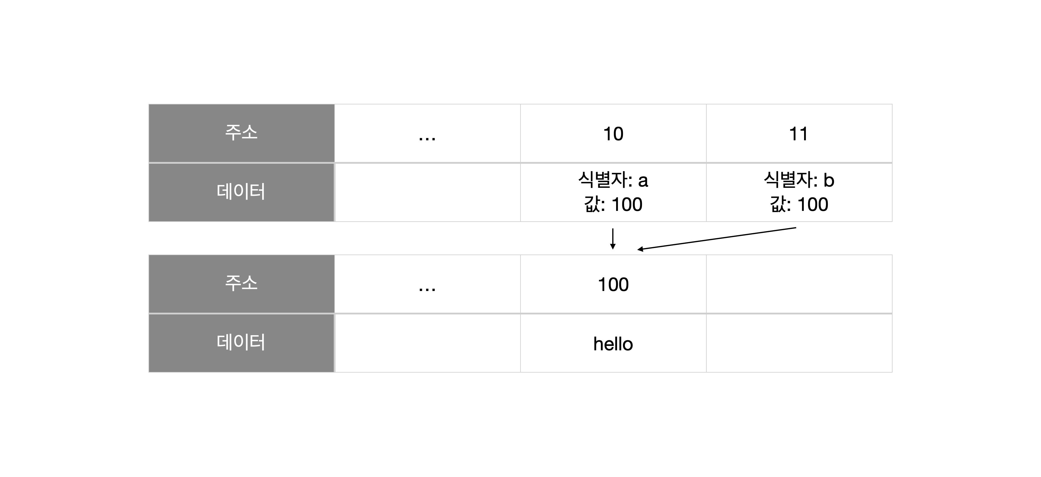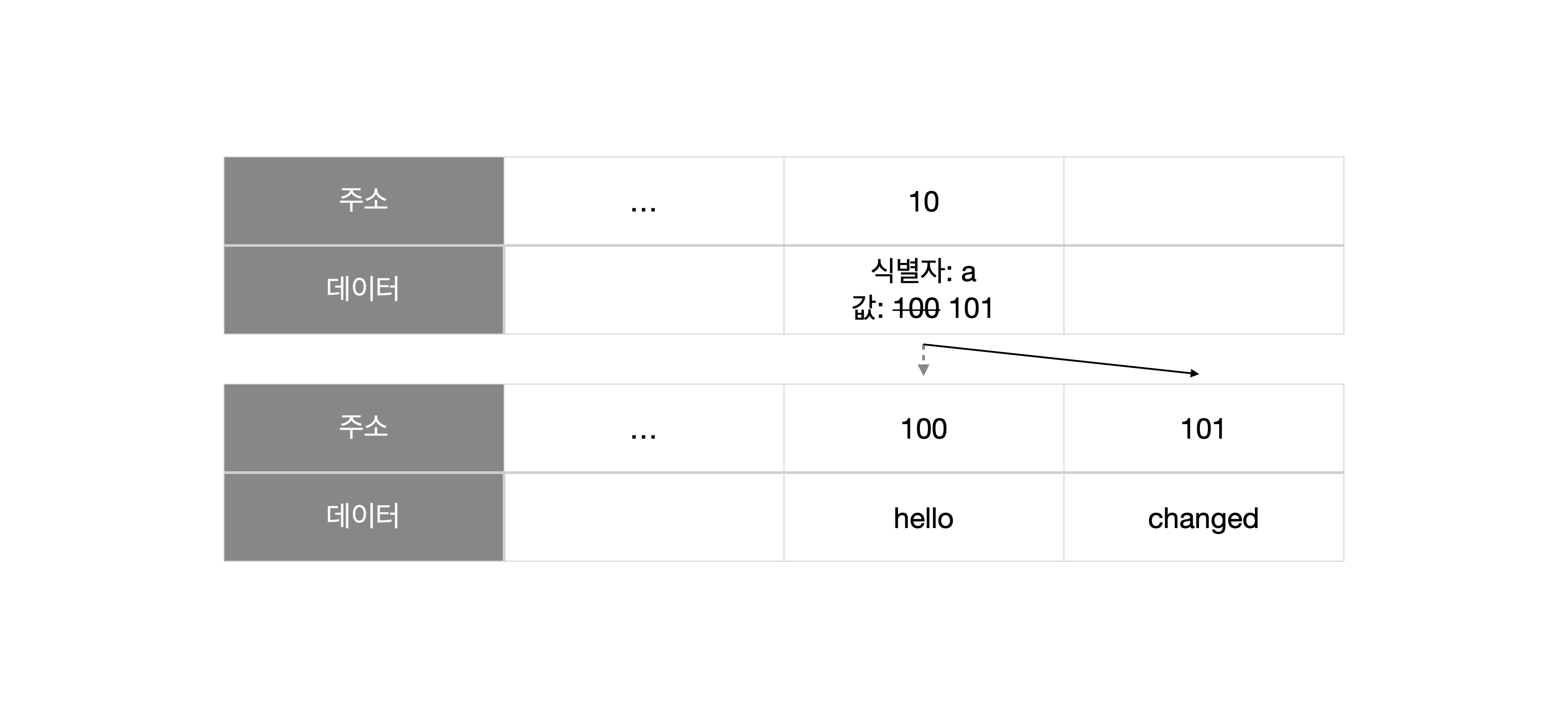 위 코드값에 따른 변수 할당에 대한 그림입니다. 식별자 a가 주소-100을 가리키고 있습니다. 해당 주소-100에는 할당된 값 hello가 있습니다.